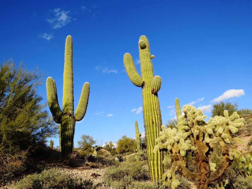 Immer wieder stellen wir fest…. die Nebenstraßen führen uns an die schönsten Plätze. Die Vulture-Mountains sind übersät mit den riesigen Saguaro-Kakteen. Bei einer Wanderung können wir uns kaum satt sehen …. müssen aufpassen, wo wir hintreten. Gut, daß wir unsere Wanderschuhe anhaben, die vielen Stacheln lassen sich nur mit Pinzette und Zange entfernen.