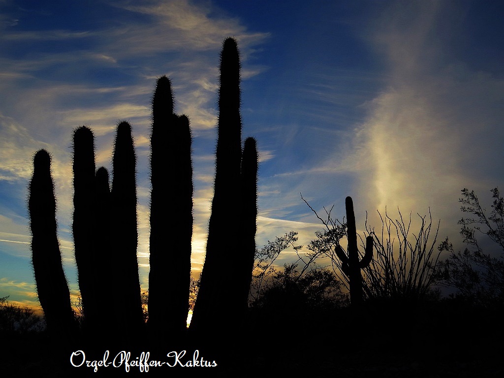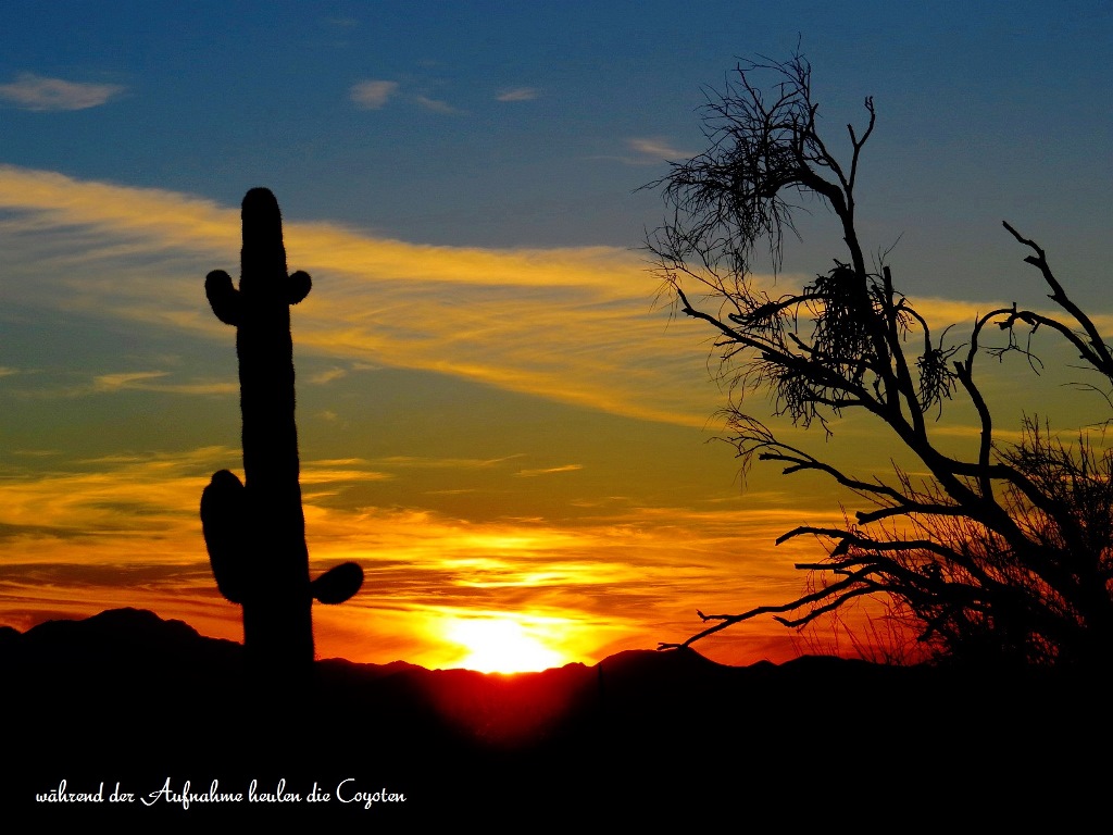 Im Land der Riesenkakteen stehen wir mal wieder in der Wüste …. pünktlich zum Sonnenuntergang hören wir die Coyoten heulen.